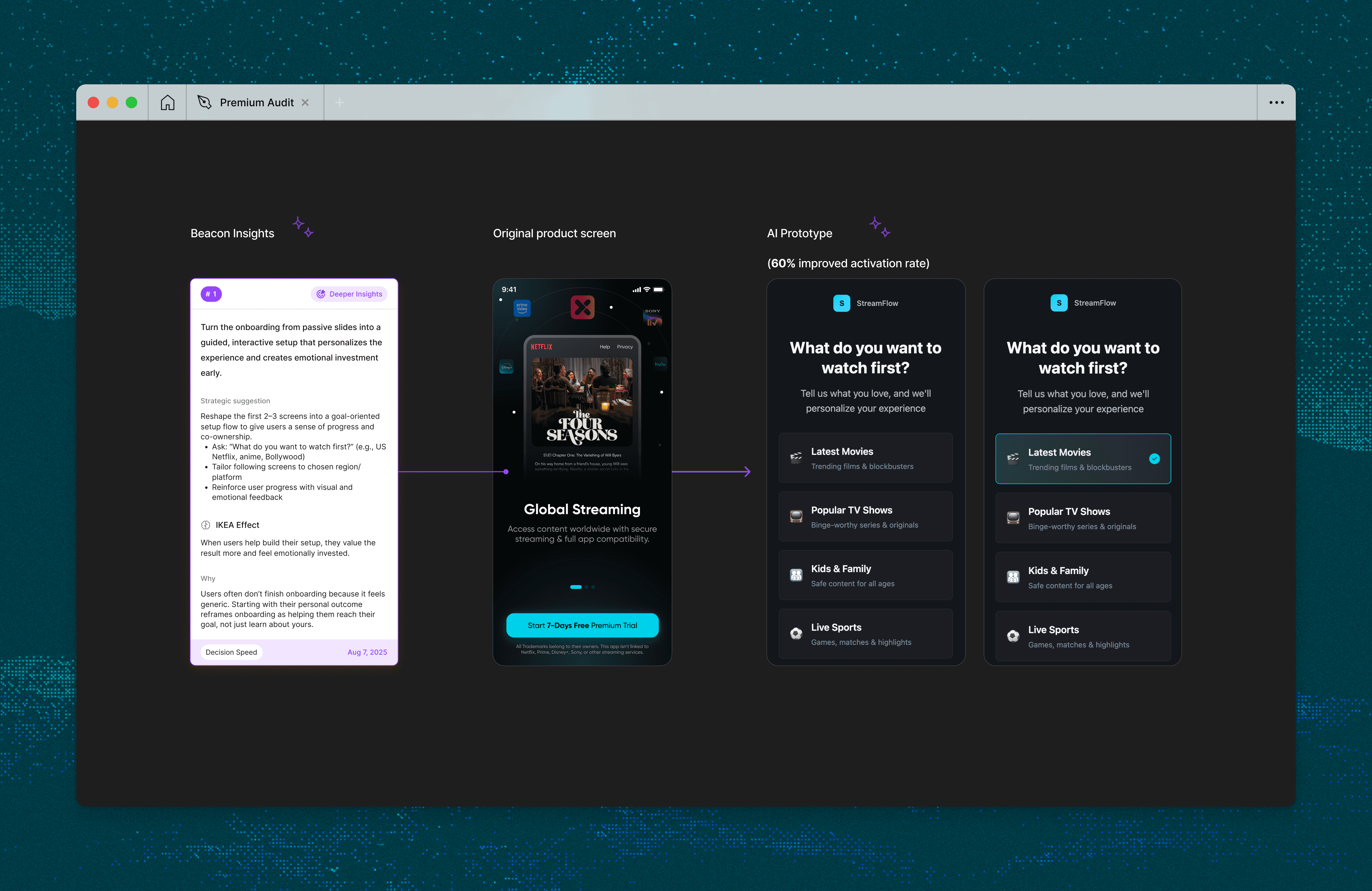 Clear, actionable insights and prototypes grounded in behavioral science and your product data—business goals, user research, analytics, and real user behavior.